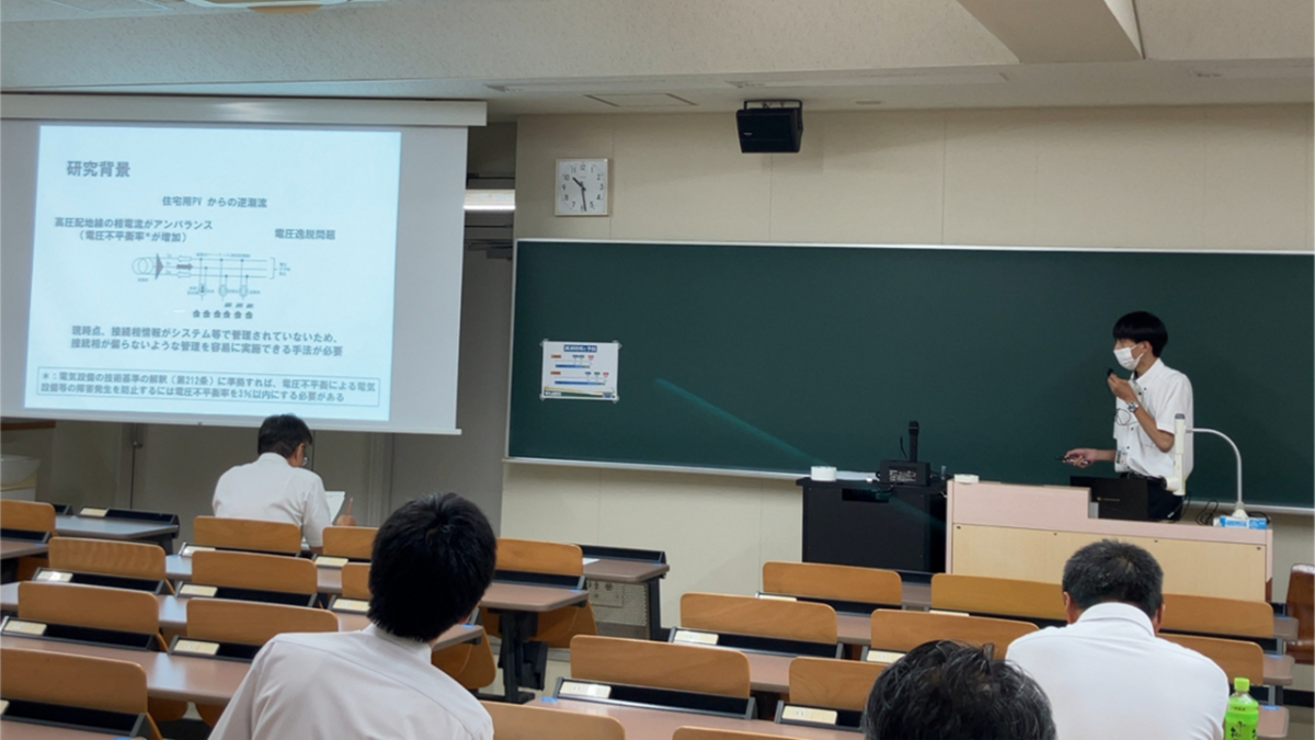 2025年9月18日~19日に福岡工業大学にて開催された2025年度(第78回)電気・情報関係学会九州支部連合大会において、電気工学科4年の松藤行知さん(橋口研究室)が「柱上単相変圧器の接続相判別手法を用いたデータ解析」について発表を行いました。また、大学院工学研究科・電気情報技術分野前期博士課程1年(今坂研究室)の学生さんも発表しました。