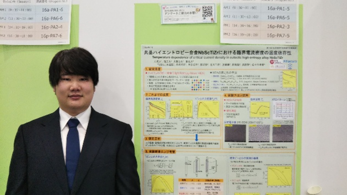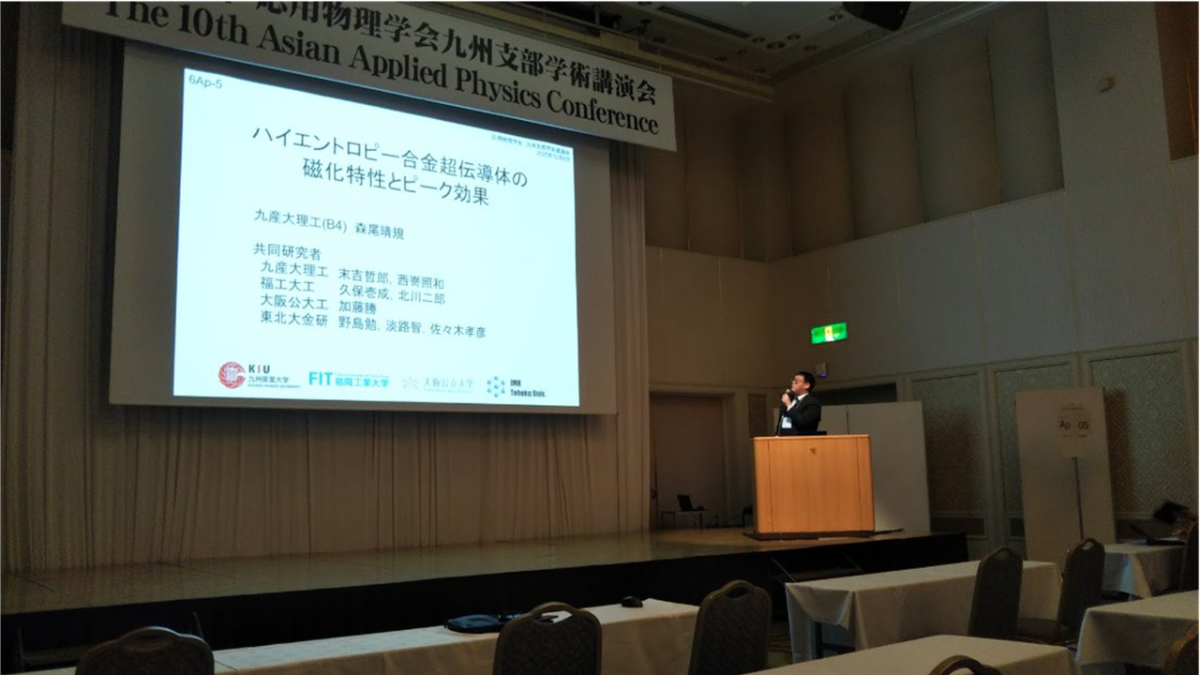 2025年12月6日~7日に宮崎観光ホテル (宮崎市)にて開催された2025年度応用物理学会九州支部学術講演会において、電気工学科4年の森尾晴規さん(西嵜研究室)が「ハイエントロピー合金超伝導体の磁化特性とピーク効果」について発表を行いました。