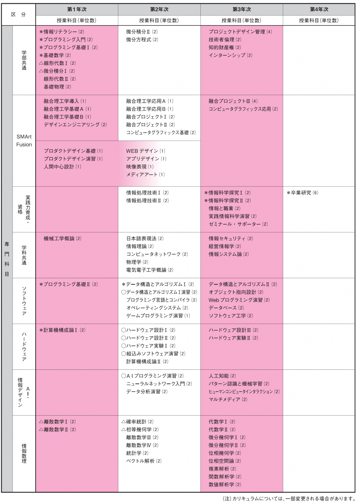 *印=必須科目( )カッコは、単位数 ⚪︎印=情報技術コース必修科目 △印=情報数理コース必修科目