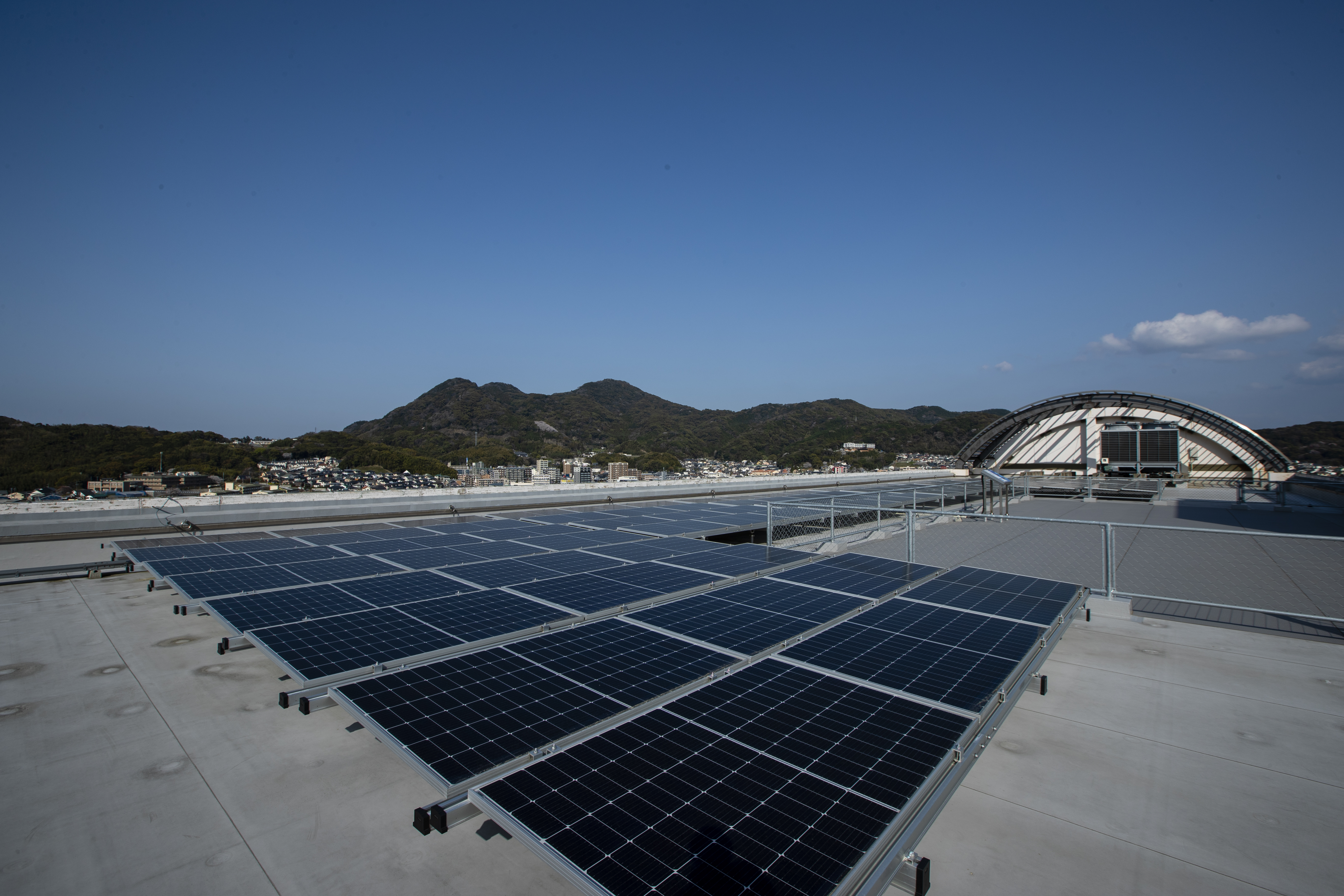 SDGsの実現へ向けて 校舎屋上に太陽光発電パネルを設置しています。学内にデジタルサイネージを設置し、発電量や消費電力量をリアルタイムで発信することで、学生・教職員の省エネ意識の向上につなげます。